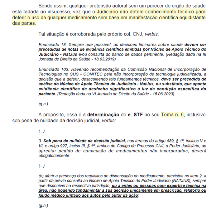 A questão ganhou novo patamar com o julgamento do Tema 6 de repercussão geral[4], no qual o Supremo Tribunal Federal converteu em exigência processual aquilo que antes se apresentava, em larga medida, como recomendação institucional: a prévia consulta ao NatJus, sempre que disponível, para a aferição dos requisitos de dispensação de medicamentos não incorporados, vedando-se decisão fundada unicamente em prescrição, relatório ou laudo particular, sob pena de nulidade.